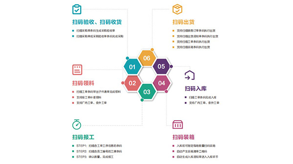 涵蓋掃碼驗(yàn)收、掃碼收貨、掃碼領(lǐng)料、掃碼報(bào)工、掃碼裝箱、掃碼入庫(kù)、掃碼出貨的全流程條碼系統(tǒng)。